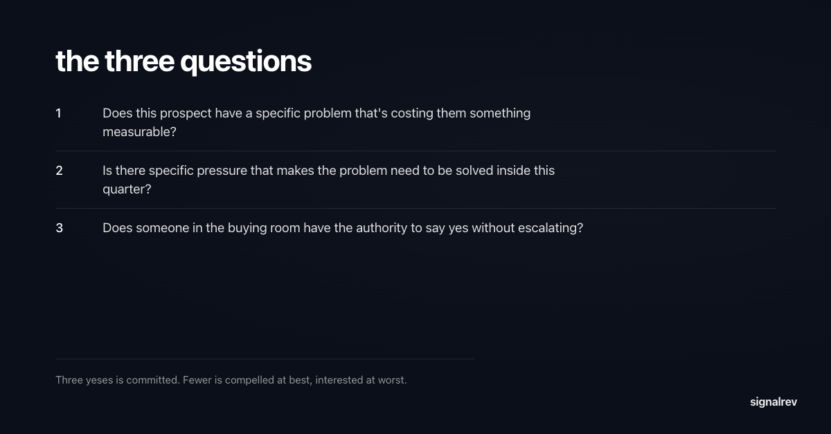 Three yeses is a committed deal. Fewer than three is compelled at best, interested at worst.