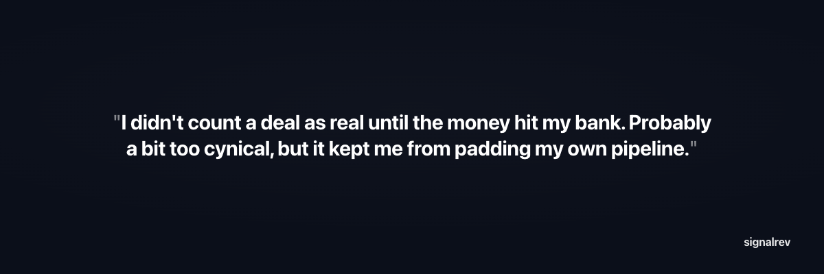 My own mantra went further. I didn't count a deal as real until the money hit my bank. Probably a bit too cynical, but it kept me from padding my own pipeline. If the wishful pipeline flowed up to the CRO, the quarter came in soft, and the miss rolled forward. Targets were annualised, which meant one soft quarter made the rest of the year harder.